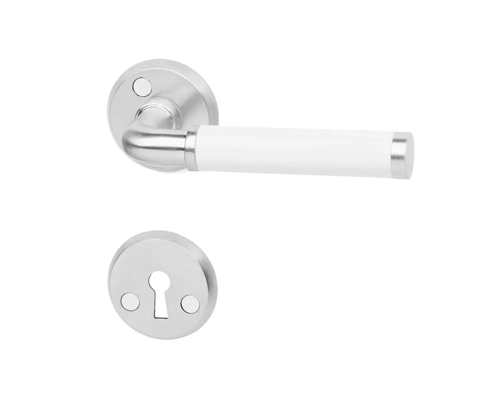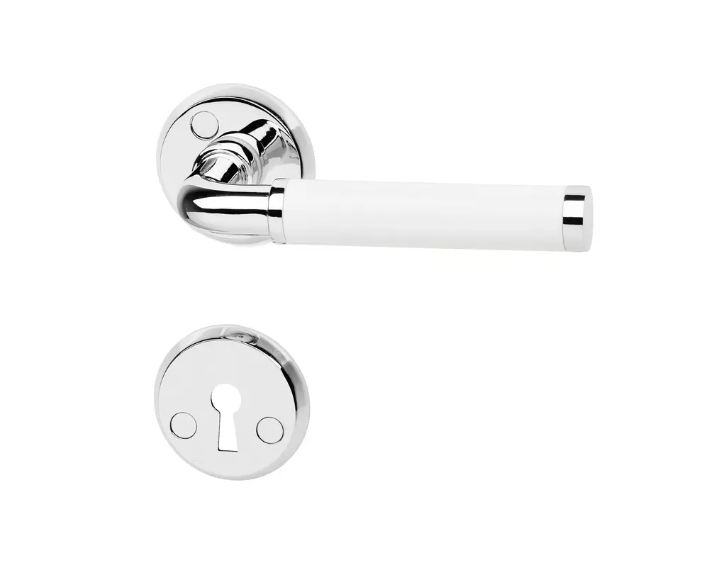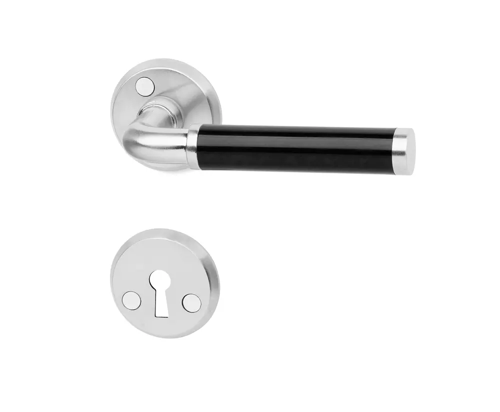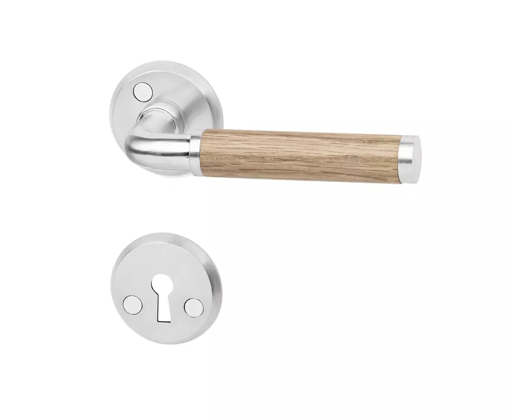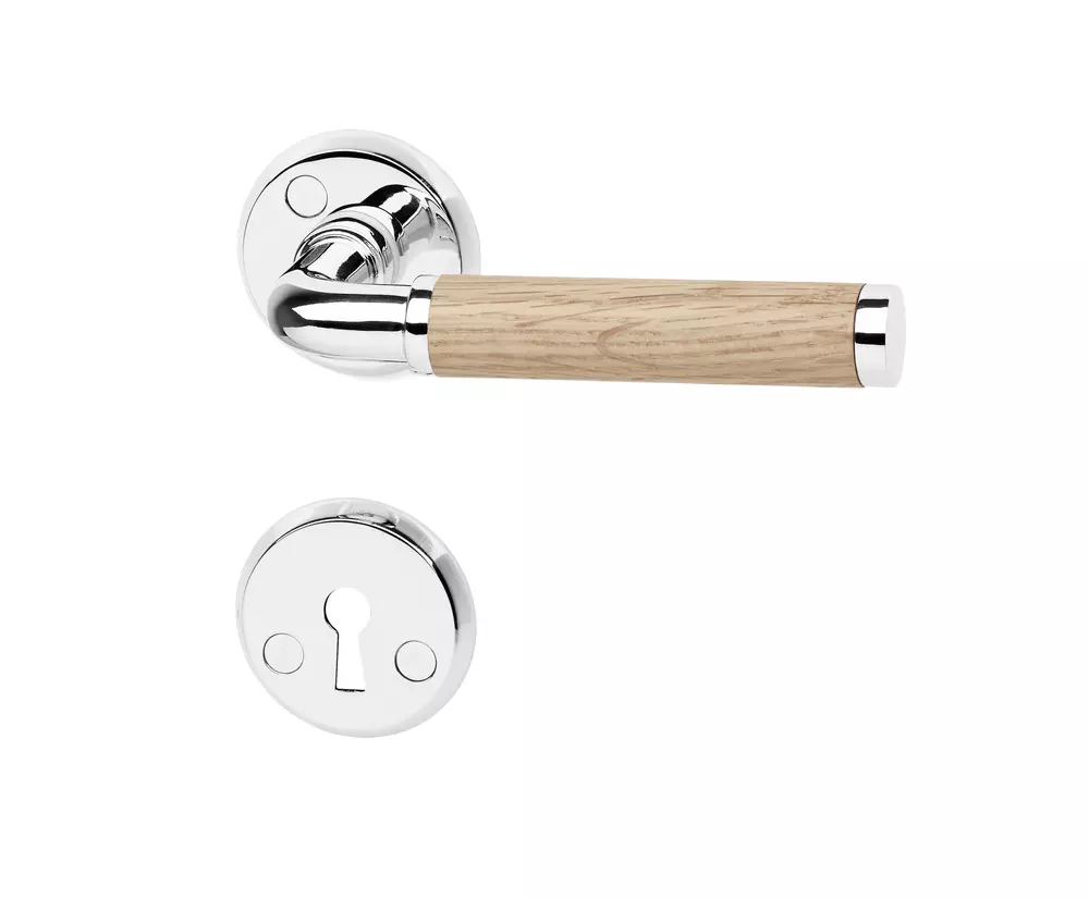 Dörrhandtag av mässing med trägrepp undantaget de med svart och vitt grepp som är av plast. Passar till dörrtjocklek 38-42 mm. Utsprång 58 mm.