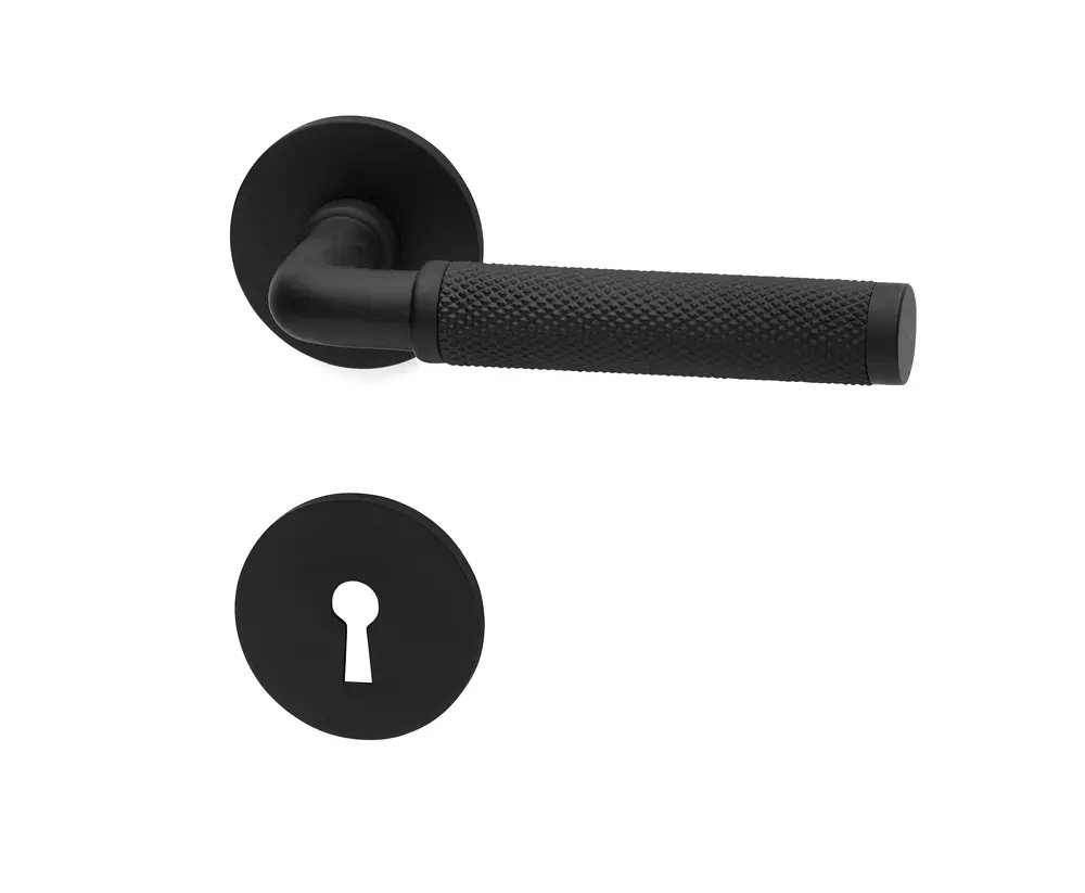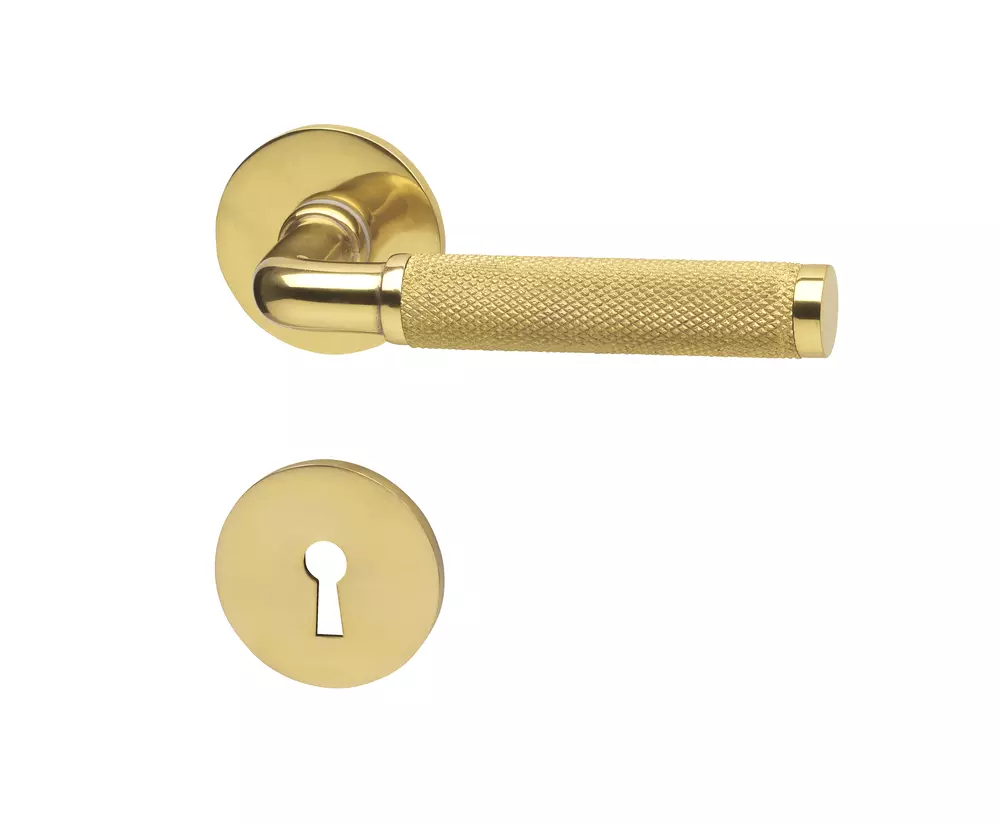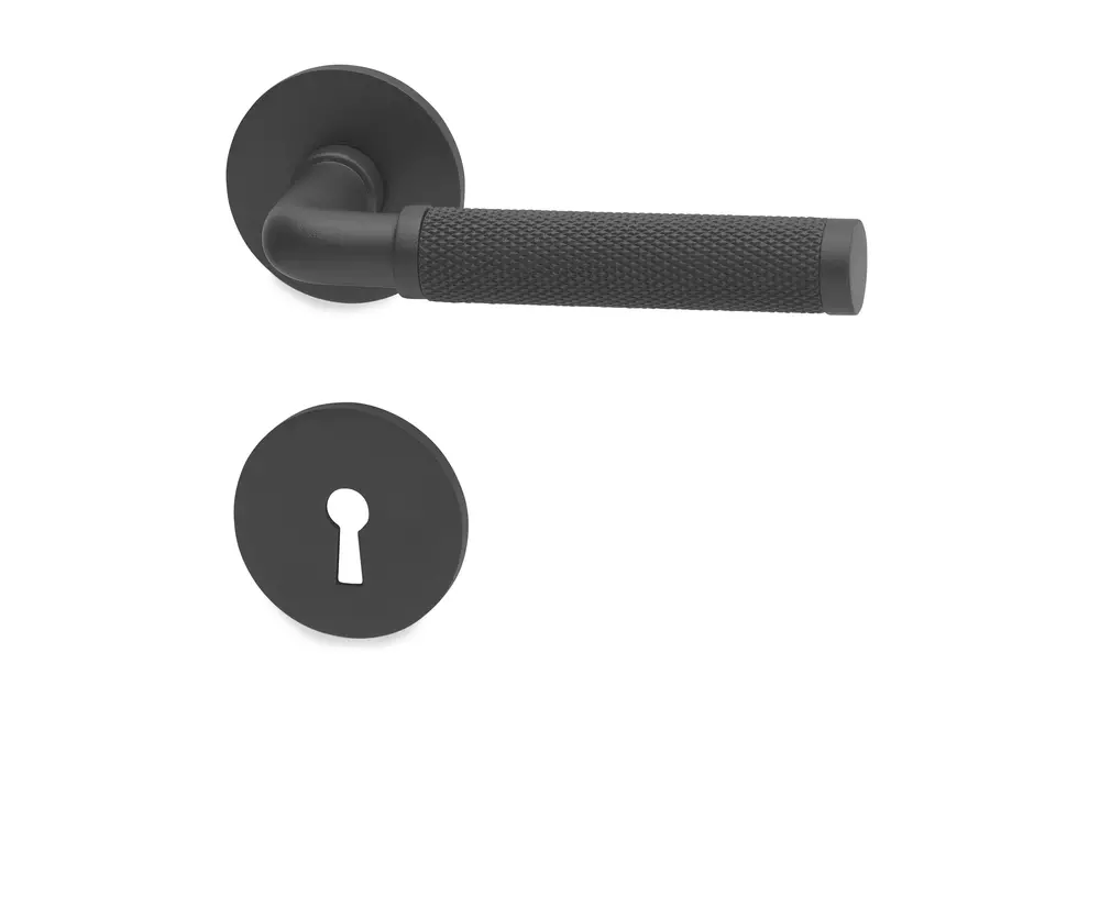 Dörrhandtag av förkromad mässing. Exklusiv modell med robust industriell karaktär. Passar till dörrtjocklek 38-42 mm. Utsprång 58 mm. Flera ytbehandlingar.