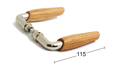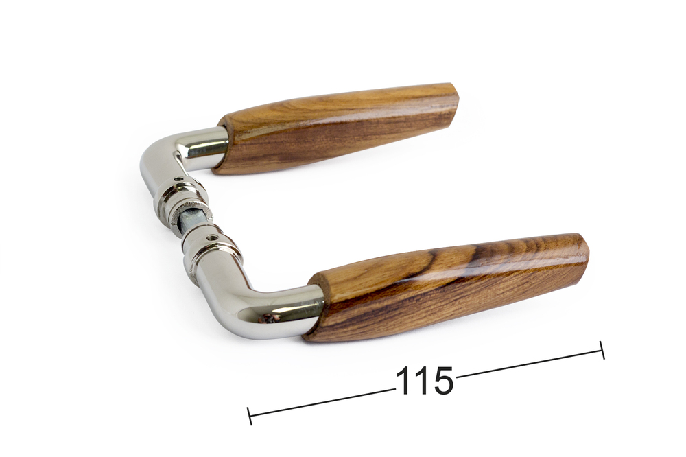 Dörrhandtag av mässing med trägrepp. Passar till dörrtjocklek 38-42 mm. Utsprång 55 mm.