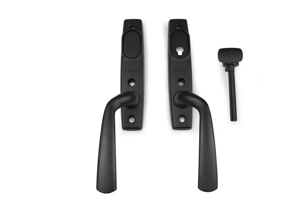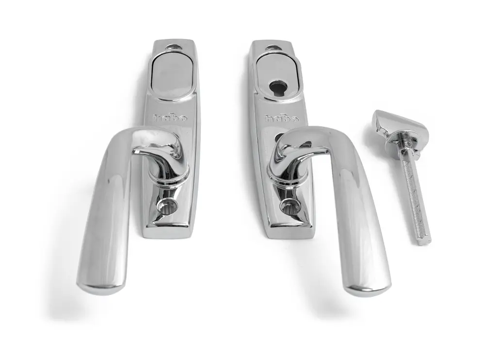 Fönsterhandtagssats av zink, inklusive långskylt. Vändbart. För dörrtjocklek 53-78 mm. Komplett sats med invändigt cylindervred, utvändig Täckbricka, 5x100 mm tryckeskruv och 8x90/100/110 roddarpinne. Vid behov kan cylindervredet monteras med "bortafunktion". Kan även monteras med ovalcylinder för spanjolett. Använd alltid längsta möjliga roddarpin ne vid montering! Pinnen ska nå hela vägen in i handtagen på båda sidor.